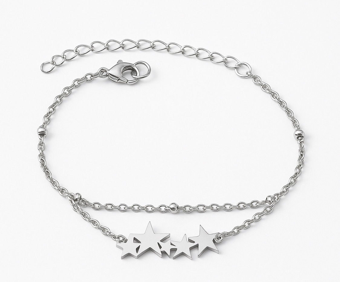 Deze elegante armband is gemaakt van hoogwaardig roestvrij staal en heeft een verfijnd dubbel banddesign. De ene ketting is subtiel afgewerkt met kleine bolletjes, terwijl de andere een rij strak gesneden sterren draagt die speels overlappen. Het ontwerp is minimalistisch maar opvallend, en geeft de armband een stijlvolle, tijdloze uitstraling die perfect past bij zowel dagelijkse als feestelijke outfits.